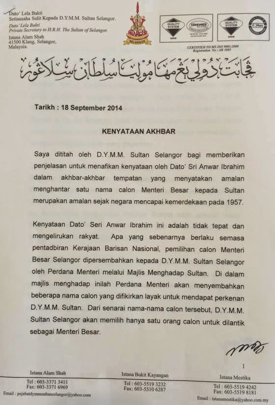Dengan keluarnya kenyataan akhbar ini, sekaligus membuktikan Anwar Ibrahim adalah seorang kaki temberang, putar belit dan pemfitnah. Setelah gagal mengheret Najib dalam kancah politik kotor lagi busuknya, Anwar kini cuba mengheret institusi Raja di Selangor pula.